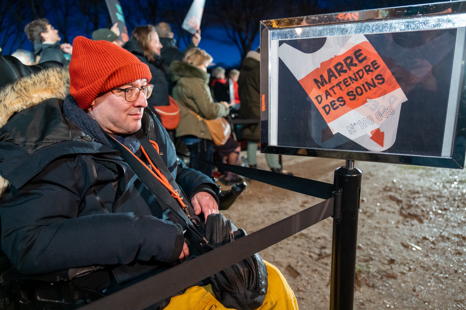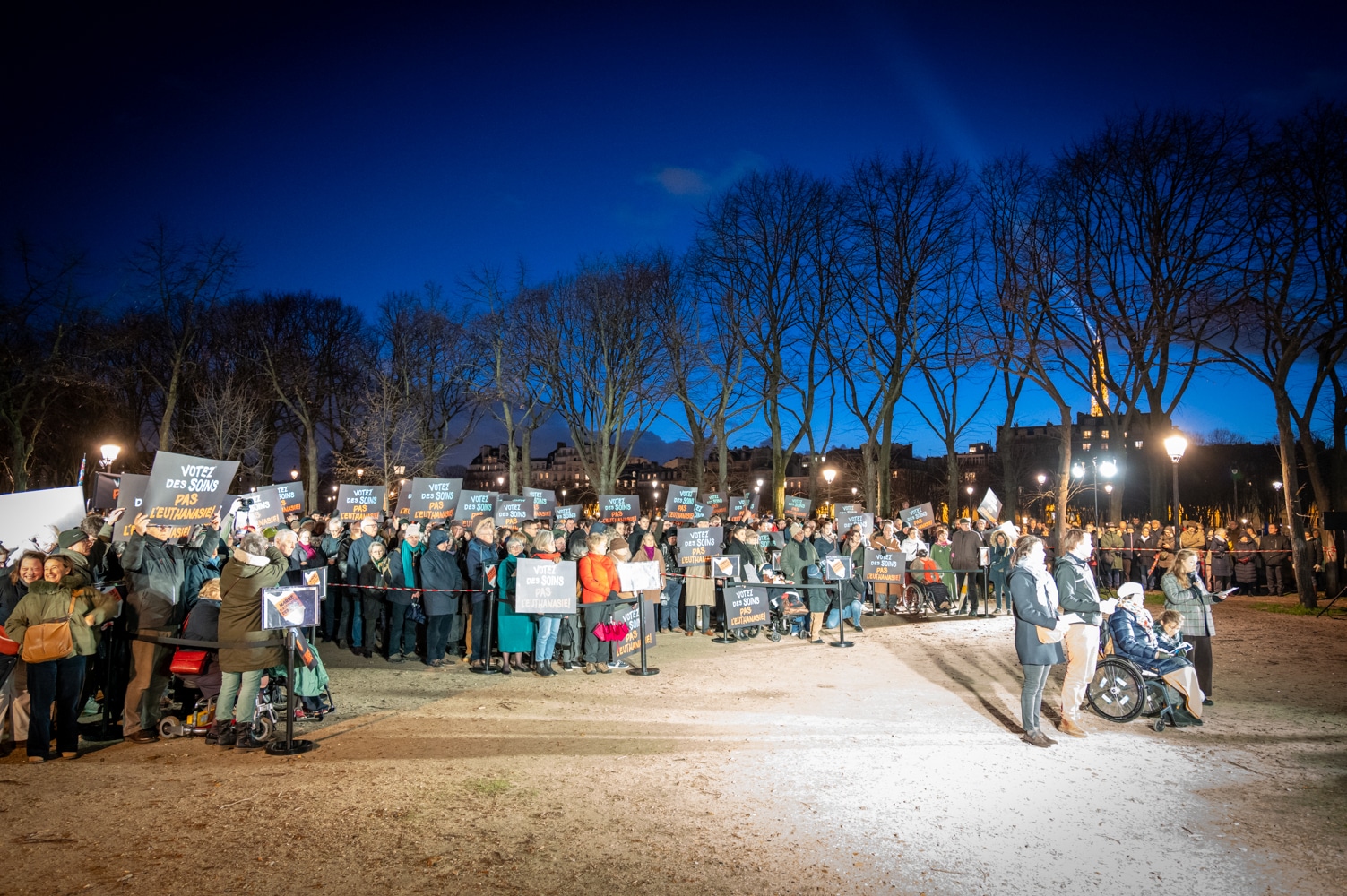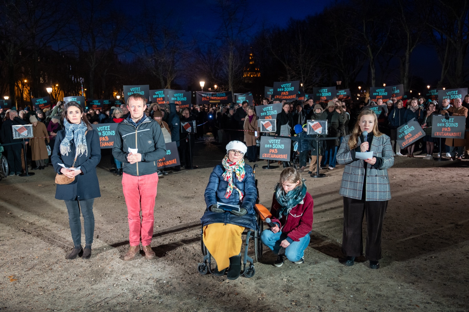 Avec des pancartes « Votez des soins, pas l’euthanasie », les manifestants ont formé une longue file d’attente illustrant l’absurdité d’un système où l’on envisage un accès facilité à la mort alors que l’accès aux soins demeure défaillant. Trois porte-paroles ont également témoigné, chacun à partir de son expérience personnelle : Jean Fontant, médecin en soins palliatifs, Caroline Brandicourt, personne atteinte d’une maladie neurodégénérative, et Véronique Bourgninaud, aidante.